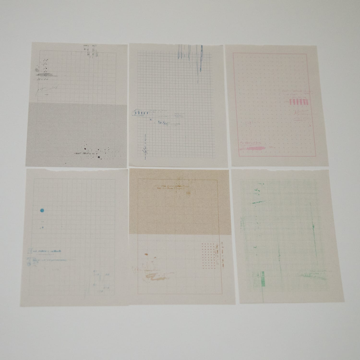 6種類の異なる方眼模様を、6色の無造作な線でふんわりと重ねました。