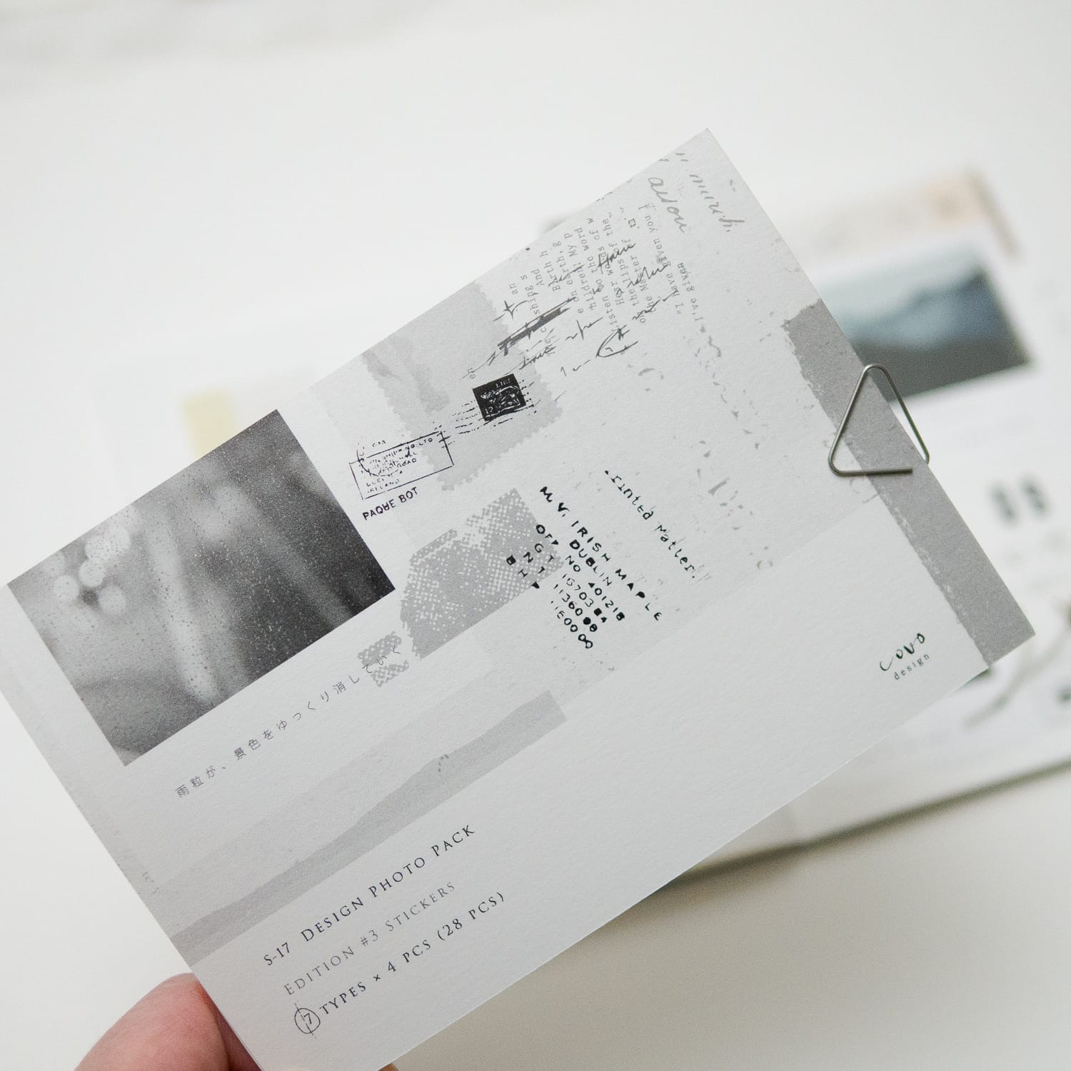 シールと紙、文字を組み合わせたコラージュデザインに、取り出しやすいポケット付き。