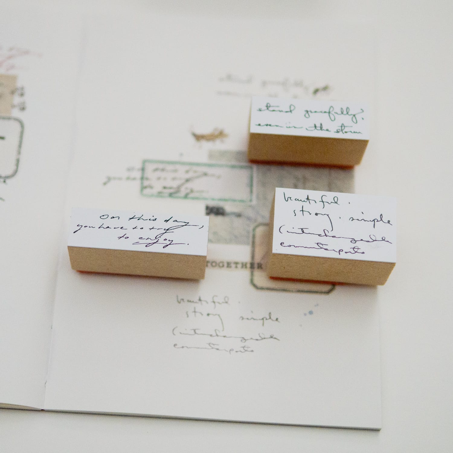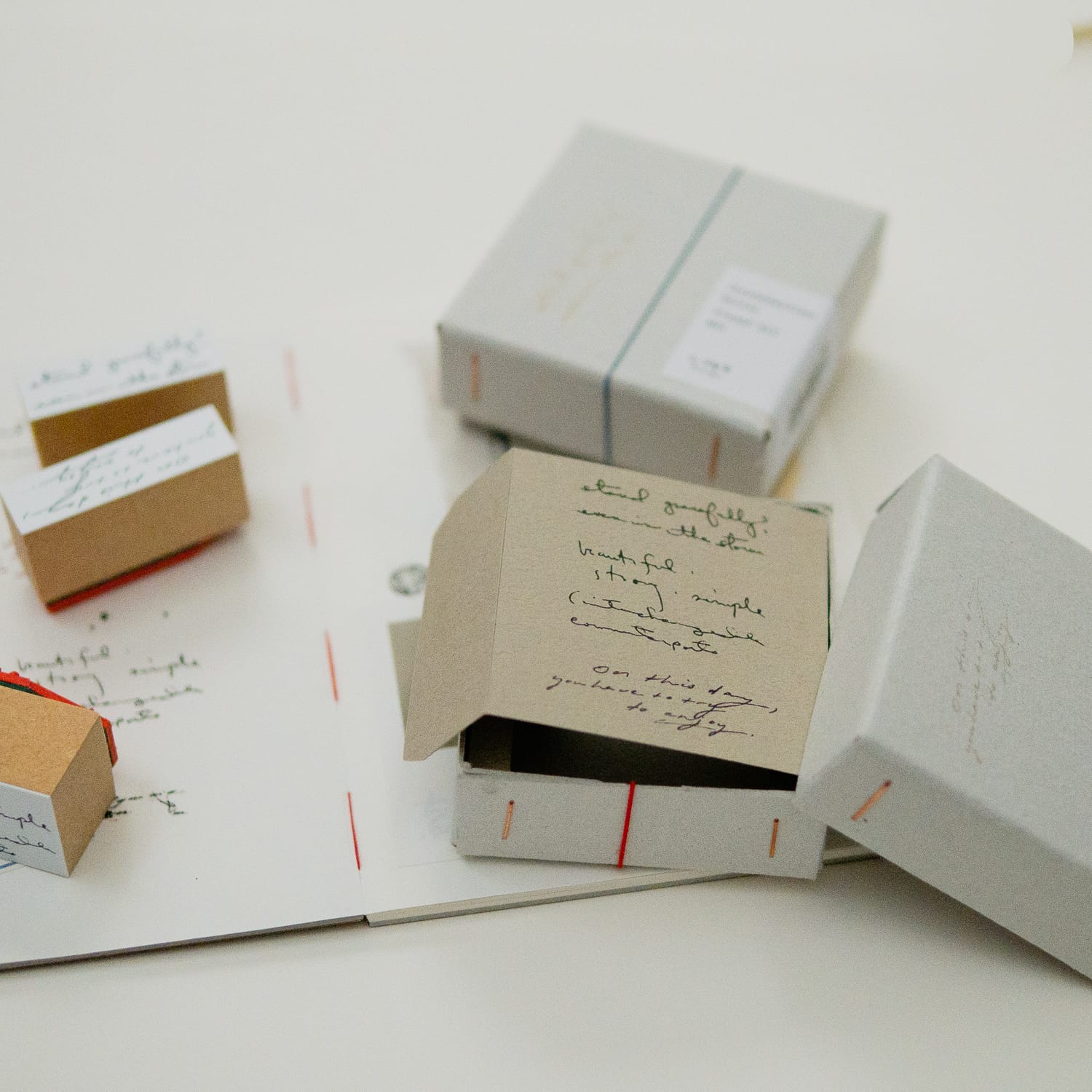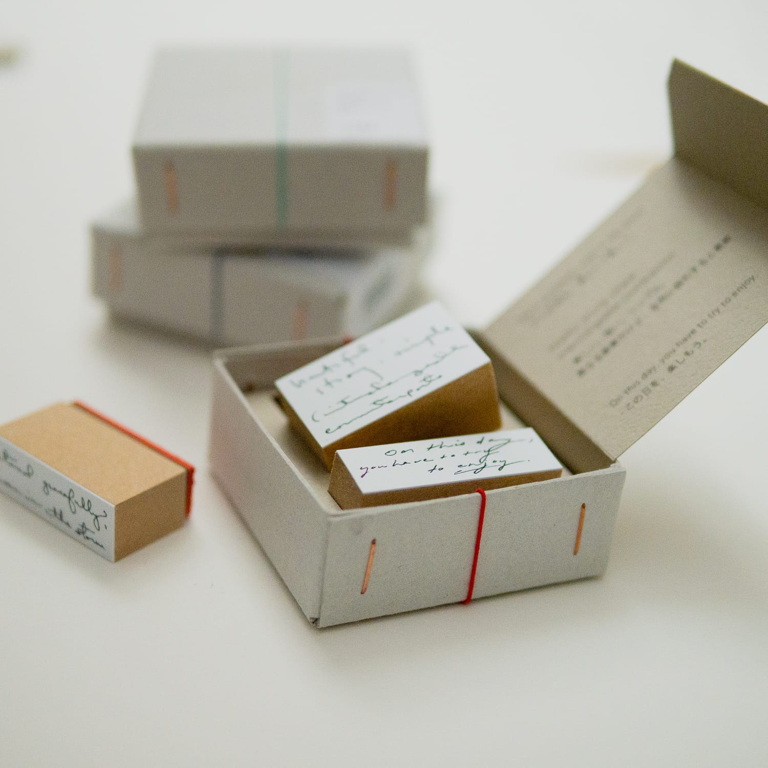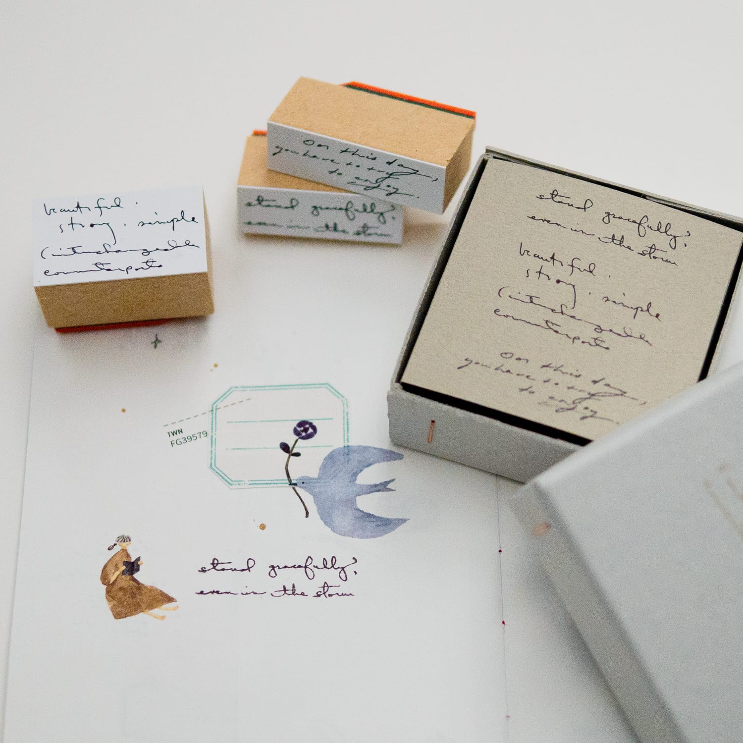 ボード紙の小箱に、静かに並んだスタンプたちが、日常のひとときをやさしく包み込みます。