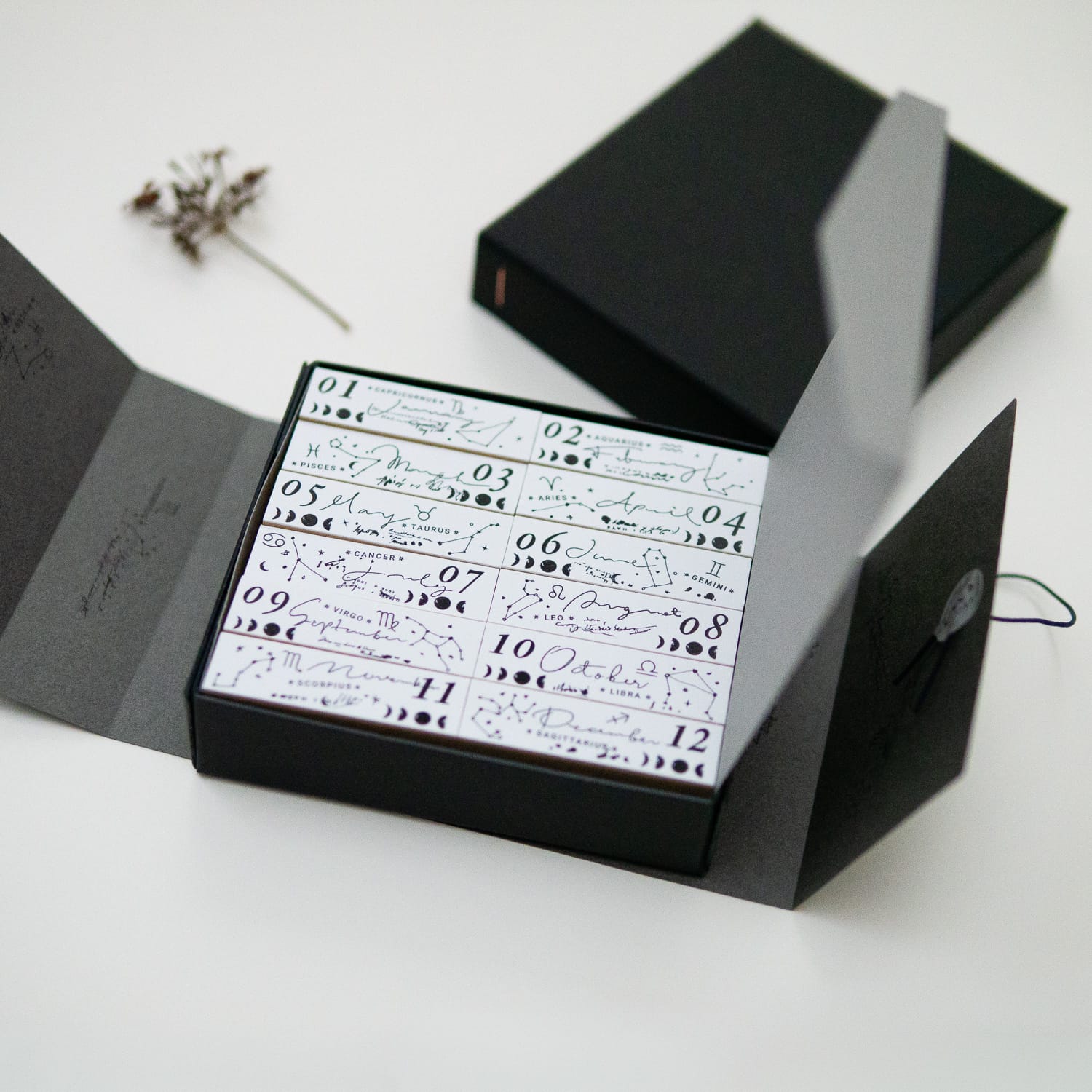 一年をめぐる12の英語の月と、12星座、月の満ち欠けを描いたスタンプセットです。