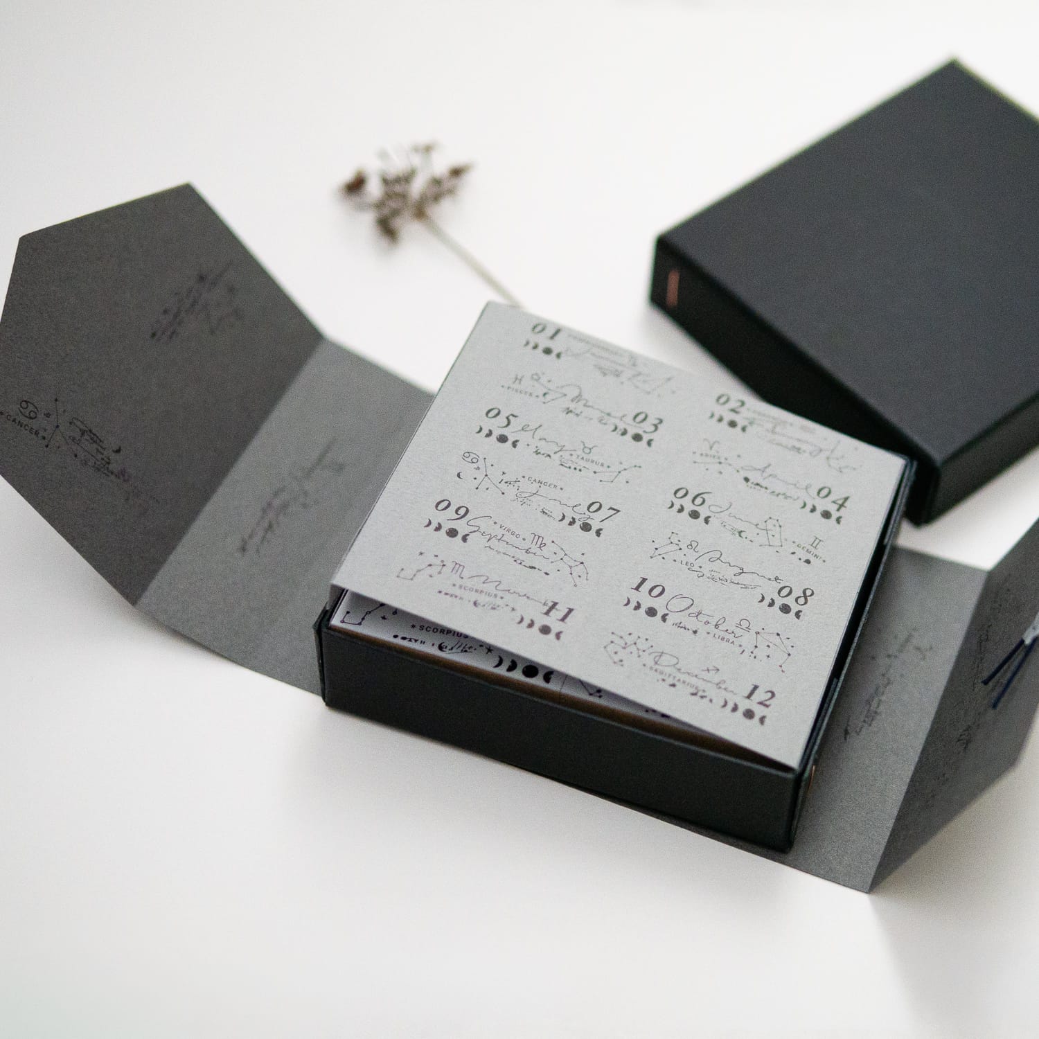 手書きの月名と星座のかたちに、月の満ち欠け(三日月・上弦の月・満月・下弦の月)と数字をを添えた、